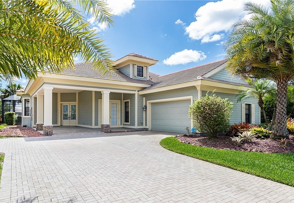 Welcome to this "Florida Lifestyle" home with a ton of extra features you don't find in new construction. This Green Certified Home starts with a Southern Verandah entry & double doors with stained glass inserts. Beautiful 14' coffered ceilings, custom cabinetry, arched doorways & crown molding show the workmanship thats offered. The oversized lanai offers outdoor living at its finest. With beautiful golf course views, an outdoor fireplace, dual sunning decks, outdoor kitchen and bar, it's the perfect entertaining space! Also included is upgraded flooring, exquisite lighting fixtures, surround sound, and a built-in entertainment center/wet bar, giving this home unsurpassed elegance & a timeless homey feel. The oversized 2 car garage has a ton of extra storage and is teperature controlled. More features include a gas stove, spray insulated attic and reverse osmosis 5 filter system. The primary bedroom and bathroom is fit for a king or queen with the huge walk in double headed shower and large soaking tub! This community features 2 award winning golf courses, kayaking down the orange river, community pool, fitness center, 9 miles of trails, bocce, tennis, pickleball and so much more!