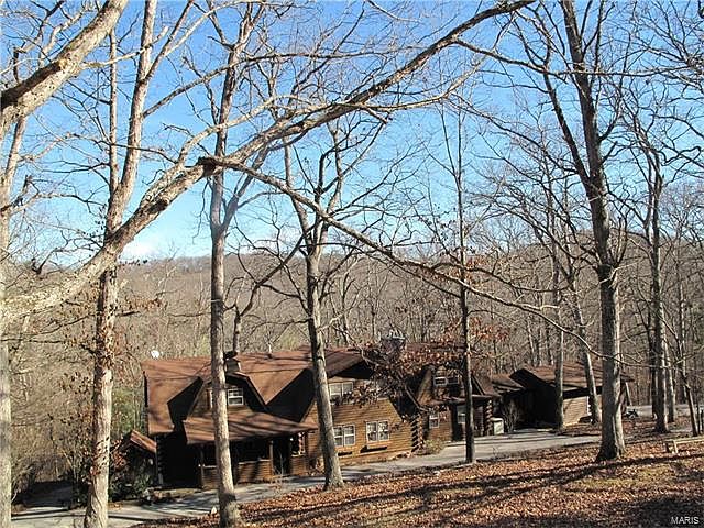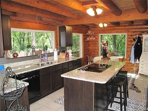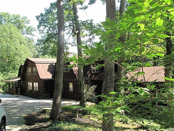 Large Log Home-Writer's retreat in an almost three acre park like setting with views of the hills at the base of the Ozarks and just 15 minutes from 270. Front door opens into a with huge great room with exposed logs, hand scraped wood floors, a see thru fireplace, and a beautiful overlooking loft. Brand new kitchen with granite counters and separate baking kitchen. This huge log home has two master bedroom suites. Four bedrooms total and four full bathrooms! New Side entry garages on either side of the circle driveway, one double and one single car. Partially finished walk-out basement with wet bar and in-law quarters. Lots of storage space. Basement workroom with additional electric panel. Huge deck that backs to woods with the tree house feeling. Garden house and greenhouse next to three tiered garden with raised beds. This is a one of a kind updated waiting for you!