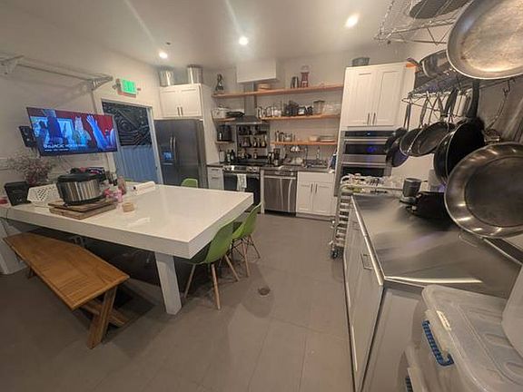We're all on one floor with a brand new stainless steel kitchen, 2 bathrooms (with multiple separate rainfall showers, bathtub, toilets, urinals, hand dryers), co-working office, media/living room, and outdoor courtyard. Furnished/unfurnished or single/double occupancy is the same rate, and any room is available with or without (or partial) furnishings and mini fridge.
