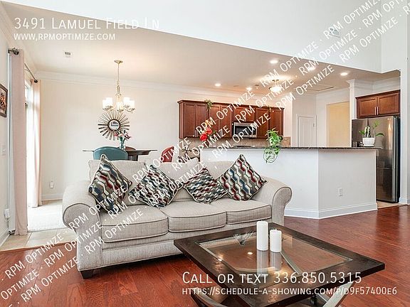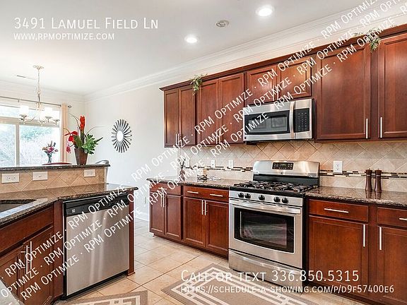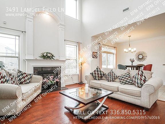 This beautiful two-story home is in a highly sought-after neighborhood in High Point. It features three bedrooms, with the primary bedroom conveniently located downstairs. The primary suite includes a double vanity sink, a large shower, a relaxing garden tub, and a walk-in closet. The home has an open floor plan with a spacious two-story living area, complete with hardwood floors and a cozy gas fireplace. The adjacent kitchen boasts granite countertops, counter seating, and a separate eat-in area, perfect for casual meals. A formal dining room is also available for special occasions. Upstairs, a versatile flex space can be used as a playroom, office, or extra living area. Two additional bedrooms and a full bathroom complete the second floor. With ample storage throughout, you'll have plenty of space for all your belongings. This home is fully furnished! A washer and dryer are also included for added convenience, while the two-car garage offers plenty of parking and extra storage. Situated on a corner lot, this home is within walking distance of schools and well-maintained paths provide the perfect setting for exercise or a peaceful stroll. High Point is a wonderful place to call home, with plenty of things to do and explore. Its close proximity to Greensboro and major highways makes commuting convenient. Whether you're looking for a great location or a comfortable living space, this home has it all. AVOID RENTAL SCAMS: Real Property Management Optimize is a licensed Real Estate Agency that exclusively markets and represents this listing. We do not advertise on Craigslist. We would never ask you to wire money, request funds through a payment app for initial rent, deposits, or take the key after your showing to move in. 9' Ceilings Back Patio Double Vanity Keyless Entry Two Car Garage Two Story Vaulted Ceilings