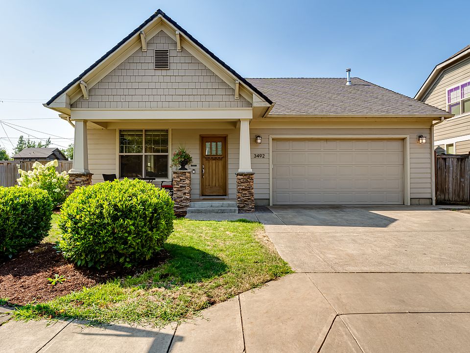 2005 built home in great Ferry Street Bridge location. 15 minute walk to Autzen Stadium, close to Oakway Center, grocery stores, etc. Main level master suite. Two bedrooms upstairs with bonus room between. Hardwood floors on the main floor and new carpet put in 2020. Large, open kitchen, gas stove/ oven, quartz countertops, covered patio, high ceilings throughout. Sheldon school district. Two car garage, sprinkler system, speaker system. New master bath custom vanity in 2022. Walk-in closet. Stainless steel appliances. Pets welcome. Landlord covers landscaping. Property is available March 1. Tenant responsible for all utilities, including garbage and cable/internet. Landlord responsible for landscaping. No smoking in the house or garage.