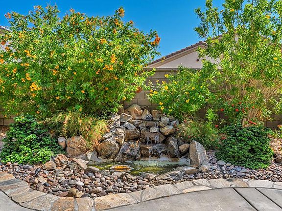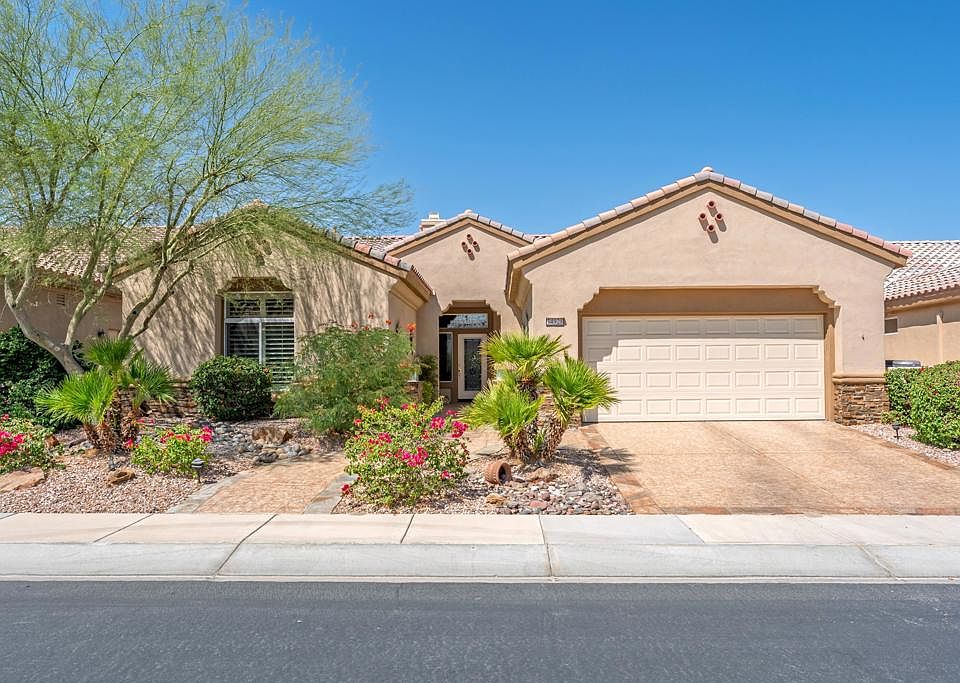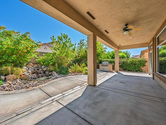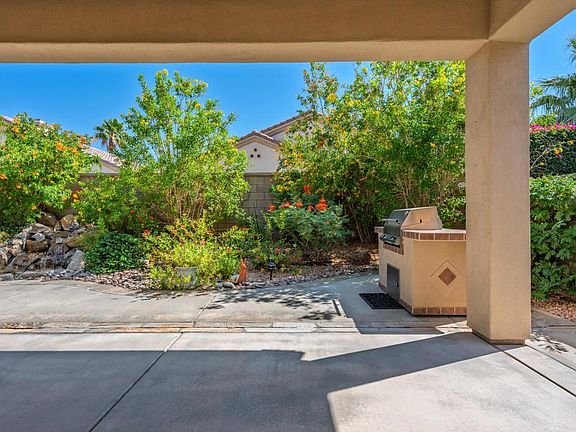 Sun City Palm Desert - Victoria. This truly great greatroom home has a spacious north facing rear yard with an extended patio and BBQ island. Stacked stone accents, lighted pilasters, decorative hardscape and leaded glass front door provide curb appeal. Inside, 10ft ceilings and tile flooring is throughout. The greatroom features a tile trimmed fireplace, crown molding and a slider to the rear patio. A den/office with custom built-in desk and shelving is off the main hallway. The chef's kitchen features a long island with breakfast bar, granite counters, under cabinet lighting, cabinets with pullout shelves, and an island with butcher block top. Raised panel maple cabinetry is in the kitchen and bathrooms. The spacious primary suite has a bay slider to the rear patio, shutters, crown molding and a huge walk-in closet with custom built-in storage. The primary suite bathroom features a stall shower with glass enclosure, an oversized tub and dual sinks. The extended guest suite is at the opposite side of the house and has a stall shower in its ensuite bathroom. The extended laundry room provides additional utility. The extended 2 car garage has an epoxy floor, nook for golf cart parking, built-in and hanging rack storage and its own AC. The home is equipped with dual Lenox AC new 2011 and 2013.