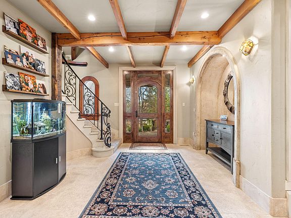 Step into exceptional quality and design in this refined Old World European-inspired haven. Upon entering, you're welcomed through the grand foyer into the vaulted living room with floor to ceiling wood burning fireplace and reclaimed wood flooring and timber beams. The recently remodeled kitchen is a chef's dream, seamlessly blending modern amenities with classic charm. The adjacent breakfast nook opens onto the sunny front patio overlooking the meandering water feature, while the formal dining room leads to the private, rear covered back patio with wood burning fireplace and hot tub. On the main level there's a primary suite and second bedroom, and upstairs includes an office and spacious loft, flanked by two junior suites. The separate mother-in-law apartment above the oversized 3-car garage makes this the perfect multi-generational floor plan. Situated on a lushly landscaped 0.43 acre lot, close to the neighborhood park and river trail. Your dream home awaits!