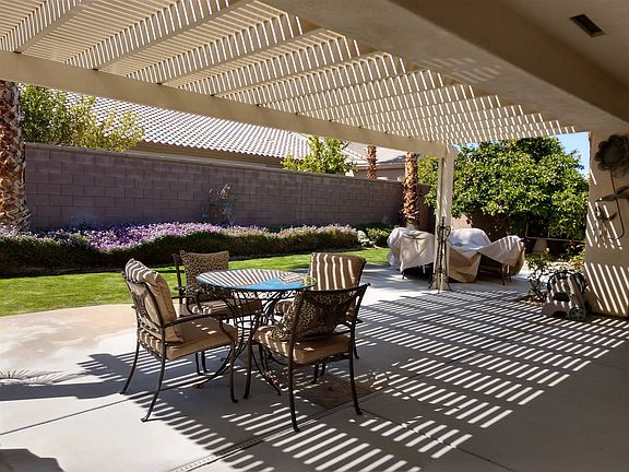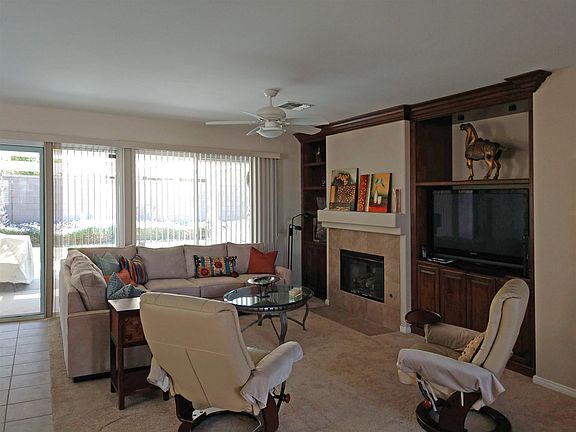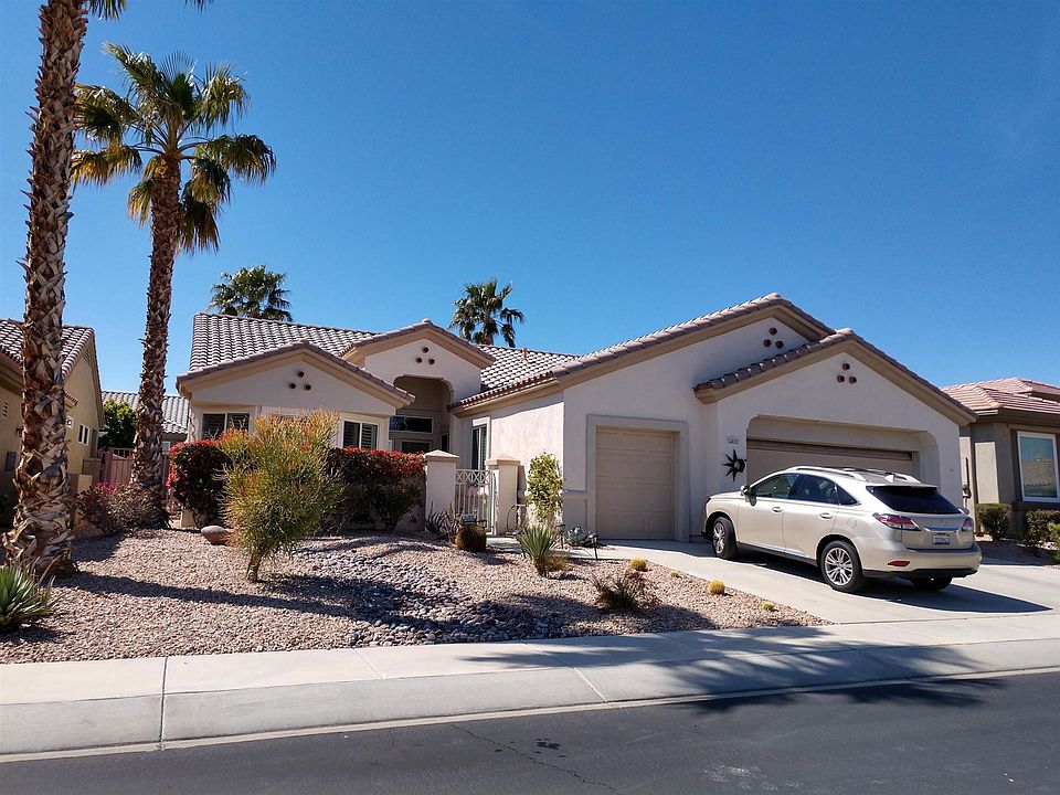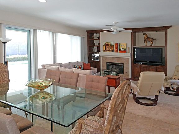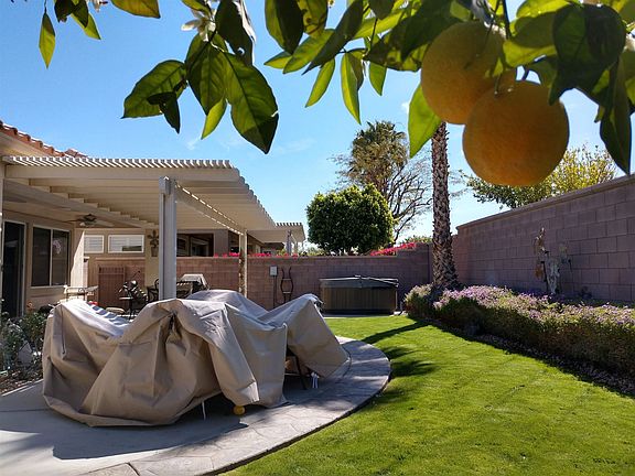 Sneak peek before professional photos!Located in the best 55+ community in the desert, this most popular model, the St. Croix is highly upgraded and has a beautiful backyard. The floors are 12'' tile and carpet. The kitchen has granite counters, pecan stained cabinets, an extra pantry, pullout shelves and drawers, plantation shutters, a wine fridge and a newer stove. The living room has a cozy fireplace with a tile surround, and custom built-in cabinets and shelving on both sides. The den is expanded by taking out a wall and making it a large guestroom/office with double French doors. It has plantation shutters, can lights, a door to the garage, and ceiling fans. The built in office is fabulous, with custom wood cabinets and all the room you would ever need to sprawl out. The master suite has an added closet and a nice view out to the lush south facing backyard. The master bath has been remodeled with marble counters, tile and marble walk-in shower, frameless glass shower door, and a large walk-in closet. The guest bedroom has a full bath adjacent to it. The 2 car garage has a separate golf cart garage, storage shelving, a recirculating pump on the hot water tank and the A/C has been well maintained. The gorgeous, oversized, private backyard has an extended concrete patio, a doggie run, lush grass, fruit trees, desert landscaping, ''Alumawood'' cover and a free standing hot tub. This home is super special and won't last long.