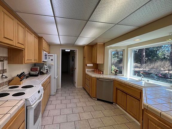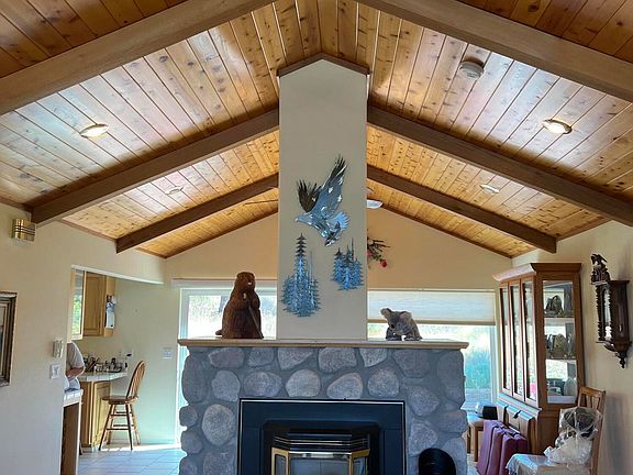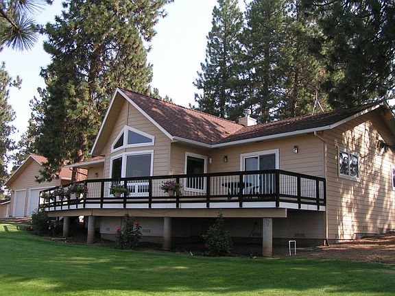 STUNNING/ONE OF A KIND view of Agency Lake!! Full-length front deck to enjoy each sunset. High quality 2,136sf home. 3 bedrooms, 2 bathrooms, 1 half bath. A bay window in kitchen for morning sun. Tile floors, stylish tile counter tops, tons of cabinet space, pull out drawers, storage tray organizer, and small breakfast bar area. Gorgeous, vaulted ceiling of knotty pine in dining room and living room with large windows for lots of natural light. 2 ceiling fans, and a Quadra-Fire pellet stove. Large laundry/utility room with long counter tops, storage cupboards and the 1/2 bath attached. Primary and a secondary bedroom have sliding glass doors to the front deck. A bright and insulated 3 car garage. Outside, find a well-manicured green lawn, lots of colorful flowers, and an established garden area with tall corn, zucchini and other vegetables. Tall pines and pride of ownership noted here.