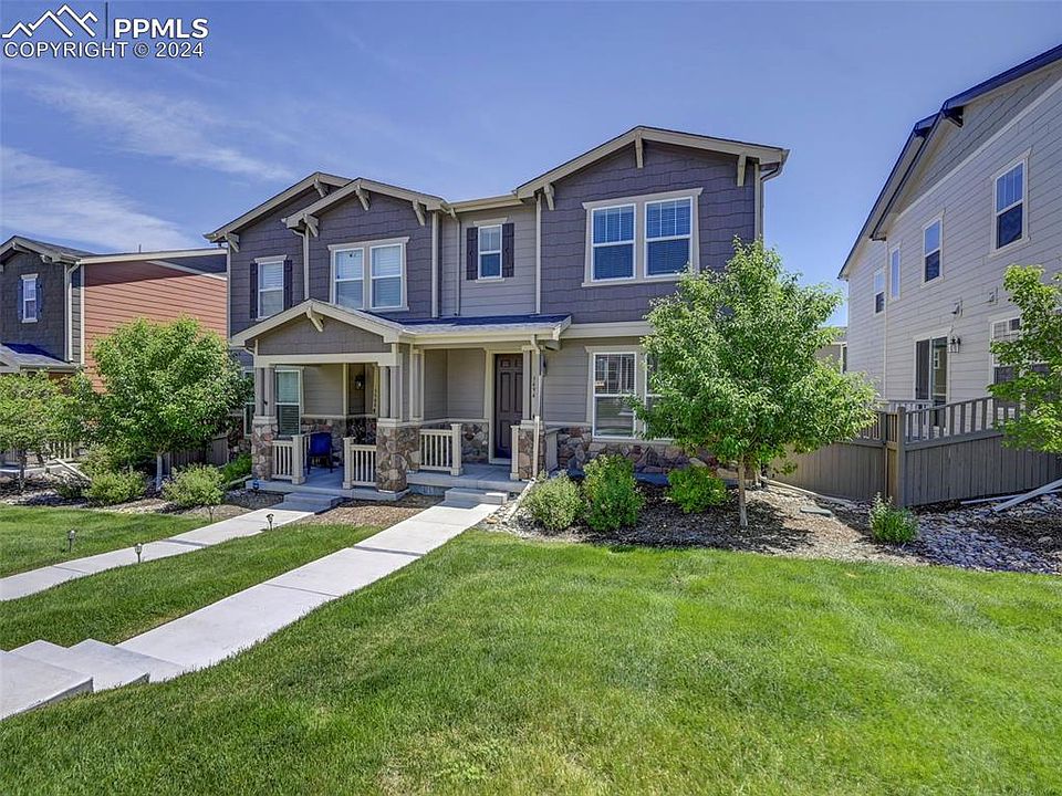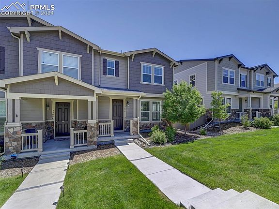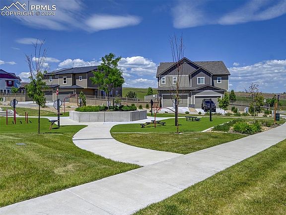 Welcome home to this turn key, immaculately maintained low maintenance paired home. As you enter you will enjoy the vast lighting, modern cool flooring/ paint and an open floorplan. Desirable open kitchen with modern tile, plenty of cabinets, quartz counters with island and a gas range. The open dining/living room design with closets and powder bath on the main level give you plenty of living space. Exit the main level to enjoy your outdoor living space perfect for a grill and outdoor fun. Three spacious bedrooms upstairs. Primary bedroom enjoys a walk in closet and attached bathroom with large shower. Laundry on upper level. Loft area doubles well as a sitting area/office space. Full two car garage for all of your storage needs. This charming neighborhood is close proximity to trails, parks, splash park, restaurants and tons of shopping. With just an hour drive between Denver and Colorado Springs you are centrally located to what all these wonderful cities have to offer. Make this pristine home yours today.