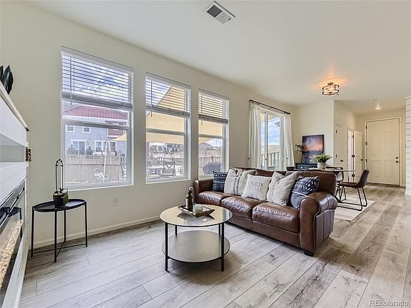 Presenting this pristine, spacious corner lot boasting 3 bedrooms and 3 baths in the sought-after community of The Meadows. This treasure showcases an inviting open floor plan, flooded with natural light through numerous windows and adorned with exquisite custom touches. The seamless flow from the kitchen to the family and dining rooms is perfect for gatherings, featuring a large island and stainless steel Whirpool appliances that remain with the home. The family room boasts a bespoke built-in fireplace with an oak mantle, while the dining room overlooks the newly constructed 16x26 Trex deck, ideal for summer entertaining. On the main floor, a versatile flex/office space is enhanced with a built-in desk and matching shelving unit, making remote work a breeze. Upstairs, the loft theater is meticulously equipped with surround sound for an unparalleled audiovisual experience, complete with a custom console. The luminous primary master suite delights with an expansive walk-in closet, a dual vanity bathroom, and breathtaking views of the meadow and mountains. HOA includes weekly front lawn mowing and yard maintenance as well as snow removal on driveways and sidewalks. This enchanting community offers an array of amenities, including extensive connecting walking and biking trails, pocket parks, and convenient proximity to downtown Castle Rock, where charming boutiques, restaurants, breweries, and local festivities await year-round. Don't miss the chance to schedule a showing today and experience the splendor of this home for yourself!