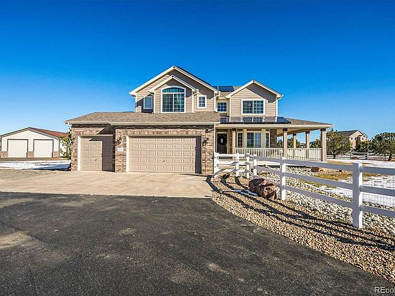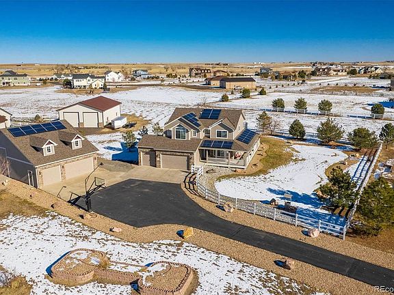 This MUST-SEE home sits on 2.4 Acres with panoramic views of the front range. This home includes a brand new roof, new windows, new exterior, and interior paint, professional landscaping with split rail fencing, a massive oversized detached heated garage with cabinets for storage, and space for RV, boat, or extra parking as well as the 3 car attached garage and basketball hoop. Step inside to admire the beautiful hardwood floors, the large foyer, formal living room, and dining room. The eat-in kitchen showcases a large pantry, newer stainless appliances, and a wonderful island for additional storage and seating. The family room features vaulted ceilings and oversized windows which allow tons of natural light. But thats not all, there is also a bedroom on the main floor perfect for guests, or a home office, as well as a half bath and mudroom/ laundry room. Upstairs greets you with a large loft and 3 additional bedrooms and bathrooms. The private master bedroom features vaulted ceilings and a large 5 Piece Bath with double sinks, soaking tub, shower, and large walk-in closet. The full unfinished basement has plenty of room awaiting your personal touch. Last but not least the picture-perfect wraparound porch with recessed lighting and a large deck is perfect for entertaining. The added solar, private well, and unincorporated Arapahoe County tax rate completes this home. Located just 10 Minutes from Aurora via I-70. You have the country feel With an easy commute to the City.