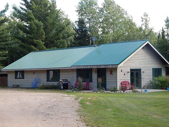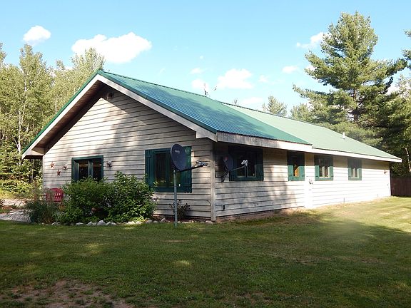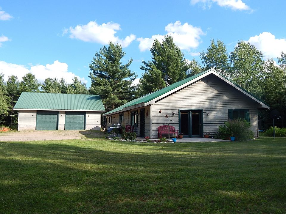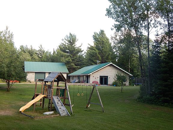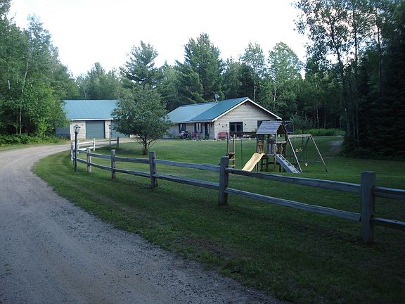 Secluded, close to town, the Chain-of-lakes boat landing, snowmobile access, 4 bedroom, 2 bath home, 6.3 acres. No thru private road, quiet, low traffic for safety. Large manicured lawn, play area. All on one floor living with split floor plan. Open concept. In-floor heat, wood burner & pellet stove. 1600 square foot garage heated & insulated with dry bar & 10 foot doors. Garden shed & covered wood shed.