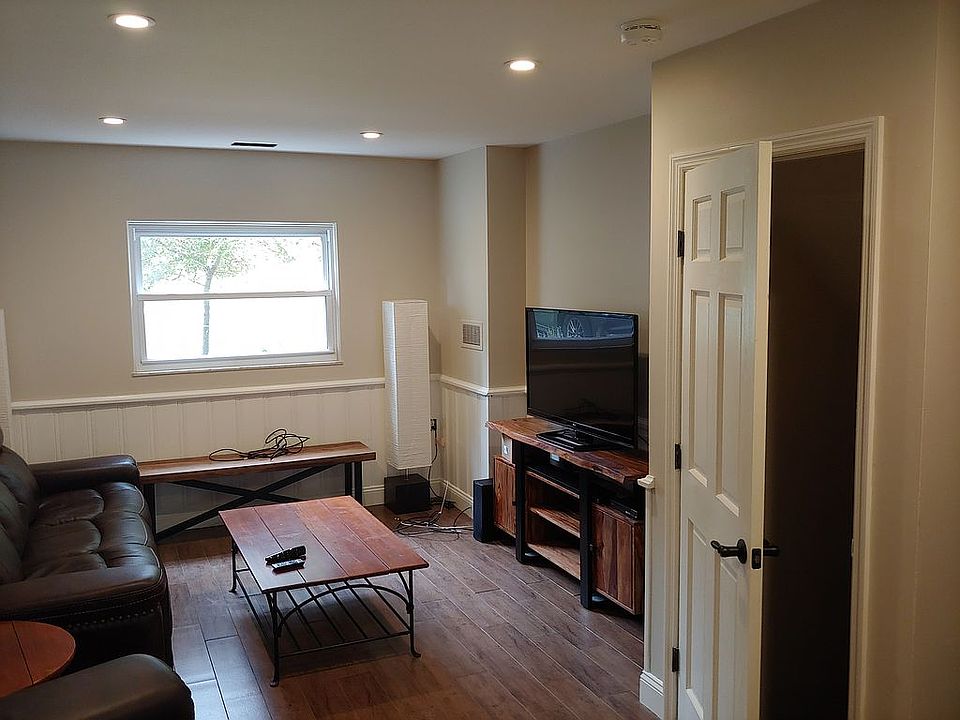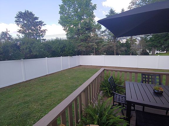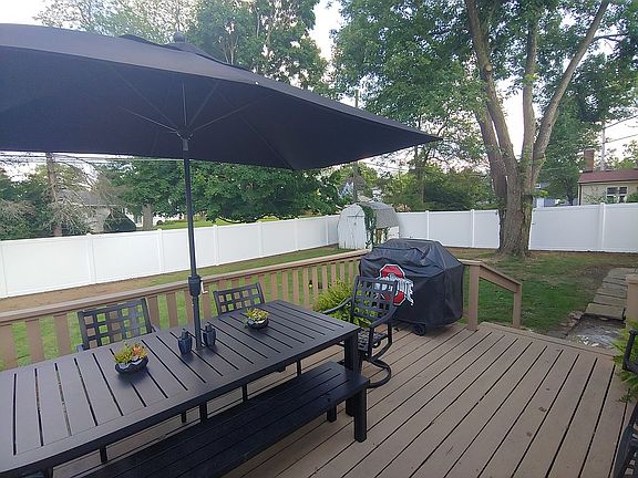 Charming and spacious 3 bedroom, 2.5 bath home on a lovely treelined street close to everything! The large living room features a bay window, refinished hardwood floors, wainscoting and a wood burning fireplace. French doors lead you into the eat in gourmet kitchen with a center island, granite counters, maple cabinets, glass tile backsplash and stainless steel appliances. The eating area opens out to a large deck for entertaining. The family room has wainscoting and opens out to the grassy yard. The lower level rec room has new carpeting and a full bath.