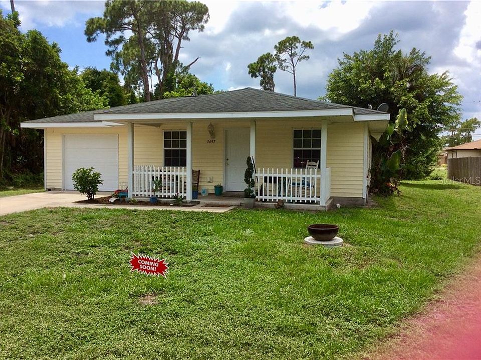 Cute and Clean home in New York section, NO Deed Restrictions. Fresh paint, NEW flooring, Front porch sitting! Living/dining room combo creates an open and welcoming feeling when you walk in the front door. The kitchen features Stainless Steel appliances and an abundance of cabinetry/counter space for a smaller home.Three spacious bedrooms (2 Baths) with good closet space and window light.There is also a bonus/exercise/playroom/man-cave room with Central Air, television hookup and concrete flooring. The new air conditioner tonnage was increased to handle the additional interior space. (Warranty transfers to New Owner) The washer & dryer in the interior laundry room do stay. There is plenty of yard space to install an additional parking pad for your boat or RV or swimming pool. NO deed restrictions. Property is super convenient to US 41 stores and amenities. Port Charlotte public golf course is just up the street! Charlotte County parks and boat ramps are all within an easy 15-30 minute drive. Port Charlotte's 2 Hospitals and medical offices are located on Harbor/Elmira Blvd; again quick access! On top of all this is Florida's sunshine! Sellers have contracted on a new home & are READY TO GO!