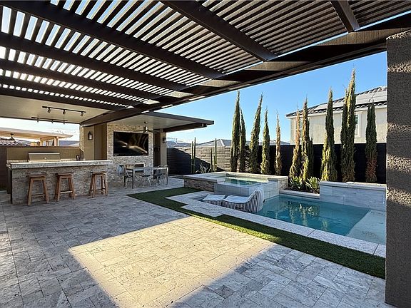 4 Bed + Den + Loft and 3 ½ Baths / Entertainers Back Yard Paradise in Inspirada / In-ground Pool & Spa / Built In BBQ with Barstool Island / Fireplace with TV above and Beautiful Patio Covers with Ceiling Fan / Fire Feature next to Pool / Custom Wood fence covering / Huge Storage area behind the BBQ area / Giant Great Room & Gourmet Kitchen with Gas Cooktop with Stainless Steel Vent / Microwave & Built in oven / Custom Countertops with Waterfall edges / Upgraded Refrigerator included / Walk-in Pantry / Luxury Vinyl Planking / HUGE downstairs storage room / Plantation Shutters / Upgraded Metal insert Staircase Railings / Spacious Loft area / Double Door entry in Primary Bedroom with some small city views / Large Walk-in closet in the Primary Bath area with double sinks and Separate Tub and Shower / 1 bedroom up front with En-suite Bathroom and 2 additional Bedrooms share another full bathroom / Make sure to check out the Matterport Virtual Walking tour on the Virtual Tour link