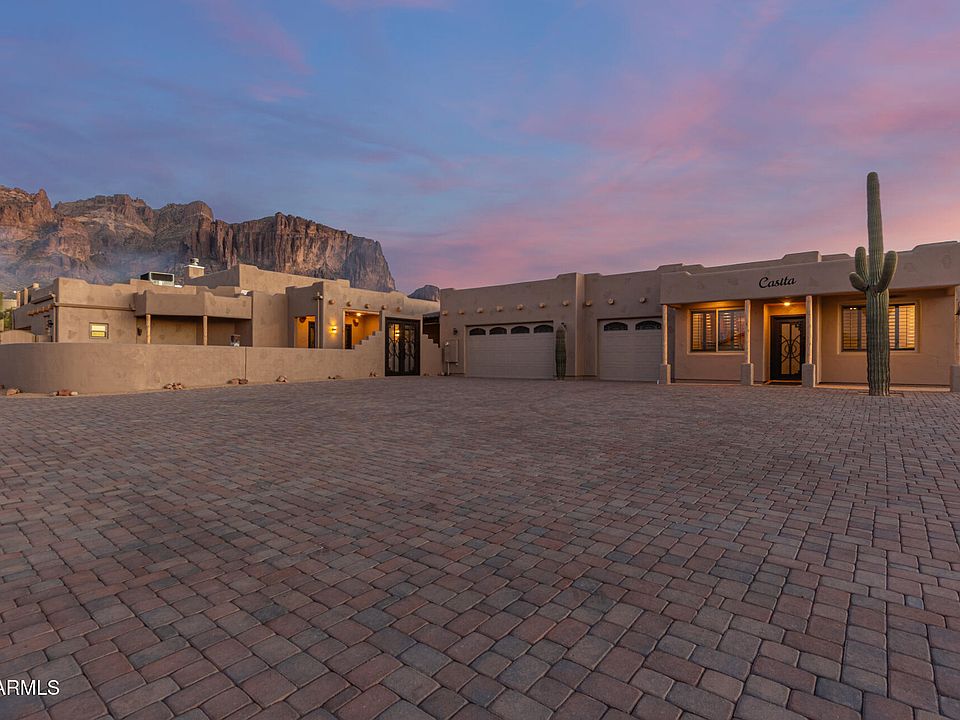 This is an outdoor lovers DREAM! This residence is nestled on an oversized 1 acre lot with FRONT ROW mountain views & featuring a natural desert landscape, AC units cooled& finished, 3 car garage, and extended paver driveway. Discover a spacious dining & living area w/elegant flooring, high ceilings, and exposed wood beams. The fabulous kitchen is comprised of soft close wood cabinetry & drawers, granite counters, a pantry, SS appliances, and an island with a breakfast bar. You'll love the primary bedroom, showcasing plantation shutters, outdoor access, a walk-in closet, and a lavish ensuite w/dual sinks. Guest quarters also boast their own kitchen! Lastly, the wonderful backyard includes a large covered patio w/a built-in BBQ, HUGE rooftop deck, and a pool/spa combo w/a rock waterfa