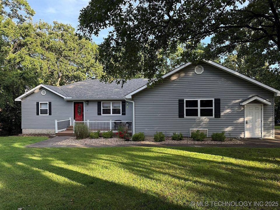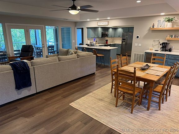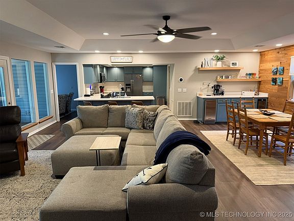 Escape to the lake in this beautifully updated waterfront property located in desirable Ketchum Cove on Grand Lake, just one hour from Tulsa. Tucked into a protected cove on nearly 1.5 acres (m/l), this retreat blends comfort, function, and fun/perfect for weekends away, fulltime living, or entertaining. The property includes a welcoming three-bedroom main home, a spacious heated and cooled game room, and a renovated barn apartment that sleeps six (but could be configured to sleep significantly more). Together, the layout offers plenty of flexibility for guests and gatherings while still maintaining privacy. Step outside to expansive Trex decking on both the front and back of the home (installed 2020), a custom pergola with UV clear panel roof and retractable screens (2024), and an oversized patio ideal for dining, lounging, or evenings by the fire pit. Recent updates ensure peace of mind and lasting quality. A Class 4 hail-resistant roof was added in 2019, along with new siding and panel insulation in 2020. The kitchen, living area, and primary bath in the main home underwent a thoughtful renovation in 2024, blending modern design with lake-home charm. The barn apartment, also refreshed in 2020, includes a kitchenette, bath, and open living space designed to host guests comfortably. Life at the lake centers around the water, and this property delivers with a new boat dock built in 2020, complete with a HydroHoist boat lift and dual Sea-Doo lift, making your waterfront access both easy and secure. There's space for everyone to spread out. Surrounded by mature trees and water views, the setting feels peaceful and private, yet you're just a short drive from Tulsa. This is your chance to own a turn-key lakefront retreat in one of Grand Lake's most desirable coves.
