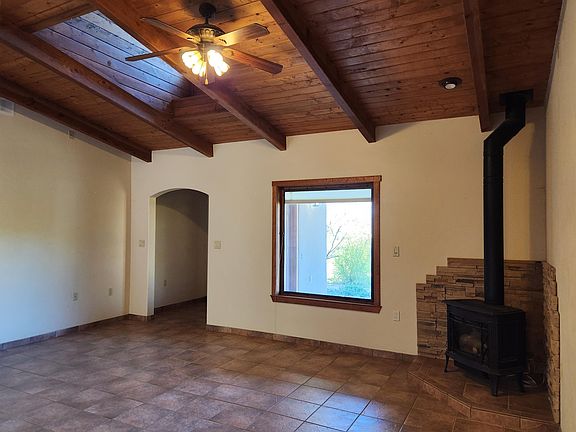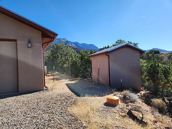 NEXT TO FOREST! 2010 SQ FT on 2 ACRES. $490,000. Custom home backing up to tens of thousands of acres of National Forest land! This 2 bedroom + studio, northern New Mexico style home is in great condition. Vaulted ceilings with exposed beams, wood T&G and dormer windows. Beautiful tile floors, with radiant heat. Primary suite is separate from 2nd bedroom. Open floor plan with stunning views of the Sandias from the spacious rear portal; awesome views of the mesas to the north too. Great kitchen with breakfast bar and pantry. Heated studio off the back of the oversize garage. Walk-in closets. Low maintenance, pitched metal roof! Spacious fenced back yard and lots of trees make this an extremely private get away! Few neighbors close by. Home is just 100 yards from the National Forest!