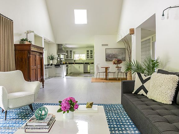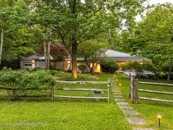 35 Abbey Road - A Mid-Century Sanctuary minutes from Woodstock Town Tucked away off of Abbey Rd and just a short pass over a charming stream you'll arrive at this pristine, authentic mid-century retreat, nestled in the heart of Woodstock's beloved Abbey Road. Set on 5.4 magical acres, this serene property captures the essence of Catskills living- graceful, grounded, and surrounded by nature's finest. As you arrive, you're embraced by lush perennial gardens, flowering trees, and native hardwoods that invite a symphony of birdsong and butterflies. Babbling brooks meander along the property's edge, and an underground electric fence spanning over two acres ensures your pets can roam freely and safely. Sunrise and sunset are spectacular here - best enjoyed from the expansive deck, the gardens, the meadow, or the sparkling 20' x 40' heated saline pool, a radiant focal point reflecting sweeping mountain views. Whether hosting guests or unwinding in solitude, this home is an effortless haven. Inside, soaring 18-foot ceilings and walls of glass flood the loft-style interior with natural light and invite the landscape in. Anchoring the main living space is a dramatic floor-to-ceiling stone wood-burning fireplace, exuding warmth and timeless charm. The gourmet kitchen is a chef's dream, appointed with a hooded six-burner Wolf range, stainless steel dishwasher, a French door refrigerator providing ample storage, polished granite countertops, and a generous walk-in pantry. A spacious media/family room offers privacy and tranquility, set apart from the main living area with sliding doors and peaceful views of the stream. Oversized closets and thoughtful storage solutions abound throughout the home, including the attached, heated garage with custom built-ins and a dedicated storage attic. Down a wide, skylit gallery, you'll find the bedroom wing, including a luxurious primary suite - a true retreat, large enough to accommodate a sitting area, complete with double walk-in closets and a spa-like bathroom flooded with natural light and outfitted with radiant heated floors. A second bathroom features a shower/tub combo. There are hardwood floors throughout the home. These wood floors continue beneath the carpeted rooms. The house has been updated with a new heat pump system offering energy efficiency. Outdoors, Trex decking provides a comfortable transition to the pool, gardens, and lawn, with thoughtful night lighting illuminating the paths, up-lit trees, and landscaping for evening enjoyment. A poolside cabana with electric and water connections adds both convenience and charm. A fenced vegetable and cutting garden provides fresh bounty through the seasons. Bordering forever-wild state land and flanked by ancient stone walls, the property offers private hiking trails for adventurous souls. For those who prefer maintained paths, Wilson State Park is just a mile away, with year-round recreation, a freshwater lake, and boat rentals. You're a mere seven minutes from the iconic villages of Woodstock and Phoenicia, and only 30 minutes to ski resorts - though once here, you may never want to leave. This is not just a home - it's paradise, found.