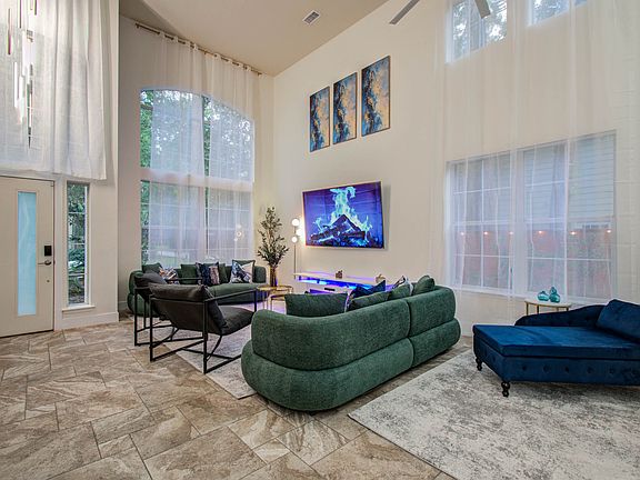This living room's high ceilings and floor-to-ceiling windows create an air of sophistication, while the thoughtful decor and furniture create a welcoming environment for you to sit back, relax, and settle into your home away from home! With two couches, two armchairs, and a chaise lounger, there's plenty of seating for everyone!