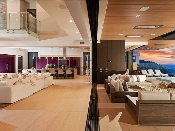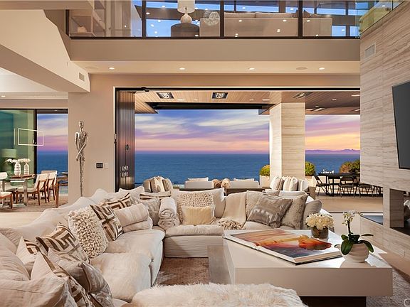 With uncompromising contemporary style, gallery-sized proportions, and a modern esthetic brought to life by award-winning designer Christopher Brandon, this unparalleled ocean-view estate occupies a league all its own at The Strand at Headlands in Dana Point. Centered around a massive interior space with a towering wood ceiling and second-story balconies, the stunning residence captures panoramic whitewater ocean views that embrace Dana Point and romantic sunsets. Floor-to-ceiling windows, slide-away pocket doors, and patios, balconies framed with glass railings, a floating staircase, and a hallway bridge lend an open, light and airy vibe to the home, which spans approximately 7,014 square feet. Enjoy 4 ensuite bedrooms, 6 full and 2 half baths, an office, elevator, lounge with wine room, oversized game room, extra-large laundry room, and ample storage. Exceptional finishes and appointments are displayed throughout, with the kitchen exhibiting top-tier appliances, an enormous island, dining area, walk-in pantry, and a separate catering kitchen. Hypnotizing ocean views embellish the master suite as well, which is illuminated by a skylight and boasts a fireplace, chic bath and generous walk-in closet. Entertain stylishly in a welcoming backyard with a pool, loggia and sleek gas fireplace. Garage parking for three is included, and a recessed entry provides a beautiful introduction. The Strand offers a beach club, open space, trails and Strand Beach.
