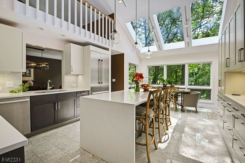 Custom built open and bright, contemporary with soaring ceilings, 2 story brick fireplace and loft overlooking living room. Fabulous gourmet chef's kitchen with skylights, overlooking private, wooded rear yard. Beautiful hardwood and marble floors. Bosch washer and dryer included. Recent master bath and powder room. Flexible floor plan with mo./dtr suite on first floor with separate enterance, also ideal for office, aupair, or great room. Big Screen TV and sound system included with all appliances. New Roof.