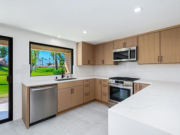 Chaparral home REMODELED TOP TO BOTTOM! This home has been totally transformed with the latest decor. OPEN FLOOR PLAN featuring new cabinets, porcelain tile throughout, brand new appliances, LED lighting and more. BEAUTIFUL VIEW of the snow-capped mountains. END UNIT! Located in the heart of Palm Desert. Full service restaurant, private 18-hole golf course - Ted Robinson design. 24-hour roving security.
