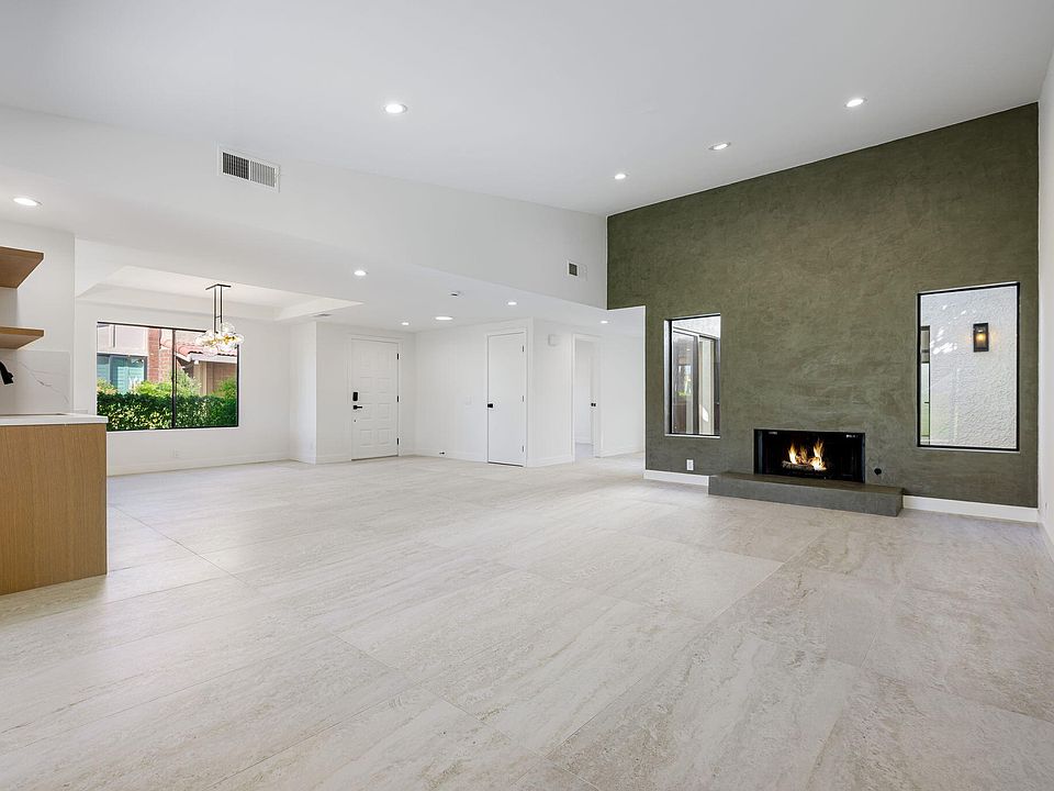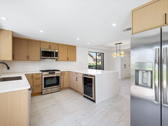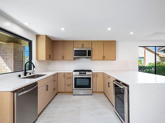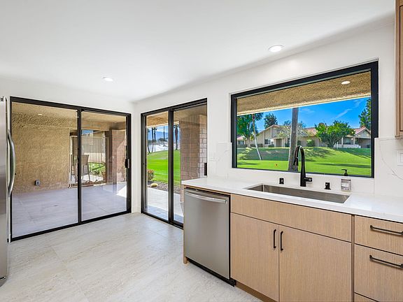 Chaparral home REMODELED TOP TO BOTTOM! This home has been totally transformed with the latest decor. OPEN FLOOR PLAN featuring new cabinets, porcelain tile throughout, brand new appliances, LED lighting and more. BEAUTIFUL VIEW of the snow-capped mountains. END UNIT! Located in the heart of Palm Desert. Full service restaurant, private 18-hole golf course - Ted Robinson design. 24-hour roving security.