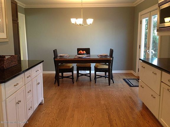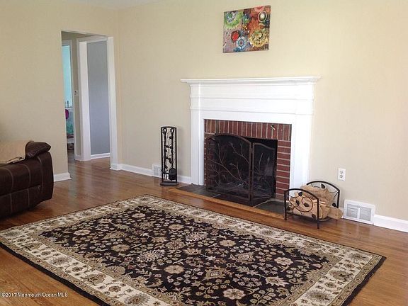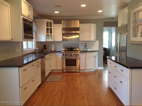 MOVE-IN READY! Expanded Ranch in highly sought after Riverside Heights neighborhood on a quiet family-friendly street with multi-million dollar homes on the Navesink River and within walking distance to Downtown Red Bank and Farmer's Market. FULLY FINISHED BASEMENT OVER 700 sq. ft. complete with home office, half bath, handcrafted custom oak bar and French drains. COMPLETELY RENOVATED INSIDE AND OUT- New siding and double pane windows 2014, New roof 2012, Central Air, Gas Heat, and Hardwood Floors throughout. Updated bright, spacious, eat-in, chef's dream kitchen with top of the line stainless steel appliances including Thermador range, hood, dishwasher and microwave, and Bosch refrigerator. Also boasts white cabinets with crown molding and numerous pullouts including pot drawers and spice rack, black honed granite countertops, and double French doors to outside. Two totally remodeled full bathrooms with beautiful patterned and marble tile, one with walk-in shower. Laundry room on main floor with Sub-Zero beverage fridge and custom concrete countertop for folding laundry. Living room with wood-burning fireplace and large family room with ceiling fan. Plenty of closet and storage space, plus full attic. Private fenced-in yard on large level lot with enough space for a pool and/or garden! Detached oversized garage with long paved driveway. Everything you're looking for and more! This is a must see!