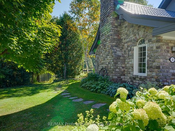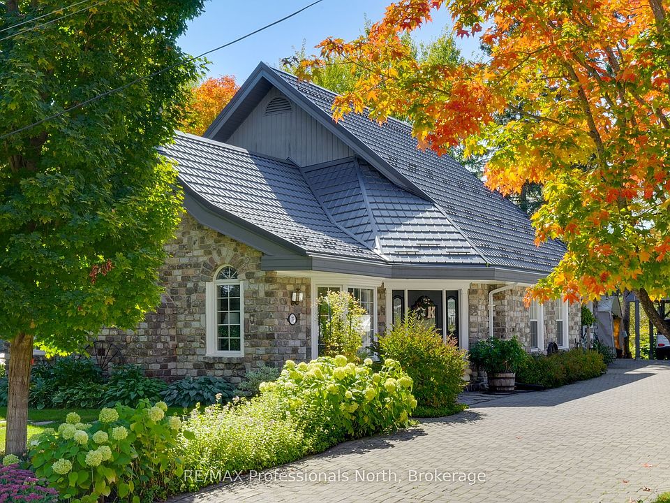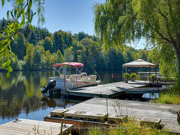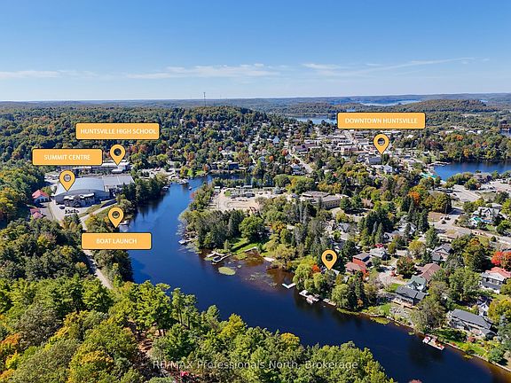 Welcome to a property so beloved, it's been admired from the water for decades - a true Muskoka icon nestled along the tranquil shores of the Muskoka River, just before it opens into the shimmering expanse of Fairy Lake. This one-of-a-kind stone-clad home captures the essence of cottage country magic - a dreamy blend of timeless charm and refined comfort, set at the peaceful end of a quiet cul-de-sac. Wander down to a gently sloping, park-like lot where mature trees sway gently overhead, and lush perennial gardens burst with color. Whispering willows dance in the breeze, casting flickering shadows on the rippling water. Nature and home blend seamlessly here. Multiple handcrafted stone patios offer the perfect places to dine alfresco, sip morning coffee, or toast the sunset with friends. Whether you're basking in the sun on the sprawling dock (approx. 12x96ft) or curling up under a canopy of stars, the river is your ever-changing backdrop. Inside, the charm continues. Step into a soaring great room with warm wood accents and beams and a cozy gas fireplace - an inviting space to gather and unwind. The eat-in kitchen features granite counters, an abundance of cabinetry, and picture windows that perfectly frame the water views. Rich hardwood floors thru-out many of the living spaces. The main floor primary suite offers peaceful privacy, while two additional bedrooms and three baths provide comfort for guests and family alike. A full basement attached garage with inside entry, and ample storage complete the offering. Only minutes by boat or on foot to the heart of downtown Huntsville, yet worlds away in feel - this is more than a home. It is a Muskoka dream made real.