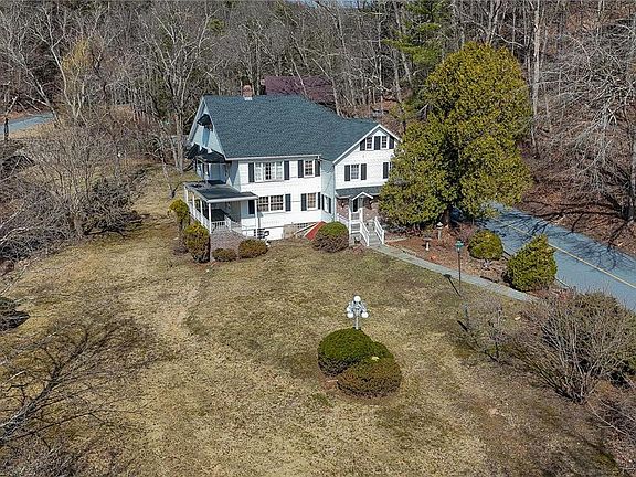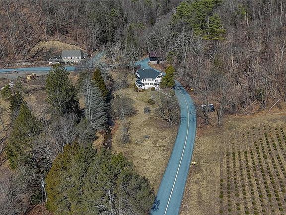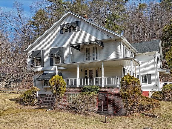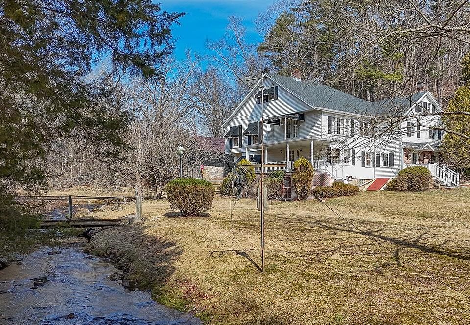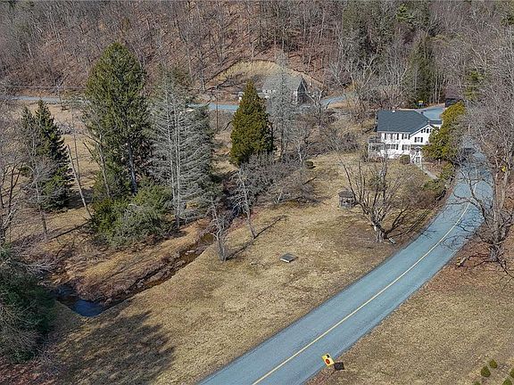Charming, unique, a grand country home. Overlooking a gently flowing stream, this spacious home offers ample living space but never ceases to feel cozy with thoughtful moments. A flagstone walk leads from the road to a flagstone front porch, then into the home’s expansive living room featuring both a beautiful coal stove and wood burning fireplace with lovely brick surround. Recessed lighting augments the abundant windows, including a lovely bow. The home’s eat-in kitchen offers ample room for gathering and food preparation with access to a covered side porch, overlooking the stream. A half-bath and laundry room are set within the kitchen. Down a few steps from the living room is a grand formal dining room, wood beamed ceiling and wood wainscoting are adorned with custom wallpaper matched in the drapes. A bay window overlooks the stream, and French doors lead to a third porch and steps to the yard. Built in, illuminated display cabinets flank the doors. Upstairs, a dedicated Master offers abundant closets and spacious ensuite, its tall windows overlooking the stream. A second Master could also be an ideal family room; French Doors lead to balcony with county views. Two additional bedrooms and two flex spaces offer abundant potential! Beyond the lovely stream, the home is surrounded by grounds of lush lawn dotted by mature trees, secluded yet within reach of every convenience. With Central AC and a newer roof this grand country home and its idyllic setting are calling to you!