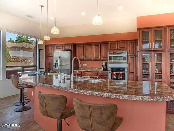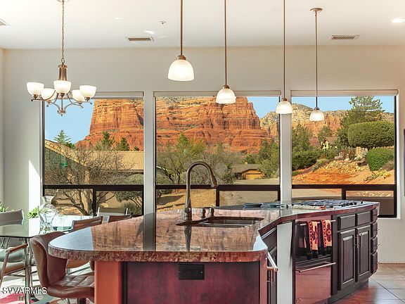 Space galore. This 4401 sq ft home has 4BR/5BA, a gourmet kitchen and a media room. Additionally, there is a living room, family room and laundry room. The main level includes a kitchen dining area with spectacular views of Courthouse Butte, Bell Rock and Castle Rock mountains. The adjourning living room has access to a covered wrap around porch with equally dramatic views. MBR and 1 guest BR are also on the main level. Down 1 flight which is also ground level, includes 2 add'l BRs with ensuite BAs, family room with wet bar/refrigerator with access to add'l covered patio, a quarter BA, and a super media room with 8 oversized recliner chairs, huge SONY screen with matching SONY surround sound system. This is a marvelous custom built home with only 1 owner.