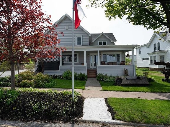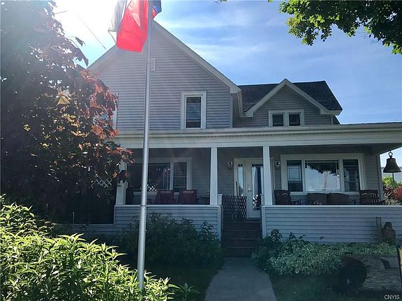 Absolutely fabulous Alex Bay village home with one of the best views in town! This 3bd 2ba home sits on a corner lot with a detached garage equipped with a bathroom and with an additional full living quarters above; consisting of kitchen, living room, 1bd and 1ba. This living quarters has a private entrance and could easily be used as a rental! In the main house, the spacious kitchen comes with a huge island and has many updates including custom cabinetry and has a sweet eat-in area in front of the massive window overlooking the St. Lawrence channel. Adjacent to the kitchen, there is a bright dining room with a half bath on one side and on the other side of the kitchen is the living room with a stone fireplace with another beautiful view. Upstairs are three generous sized bedrooms and an updated bathroom. Front porch provides another great outdoor living space to watch the sunset and the ships pass by, and even has a hot tub tucked away. Current owner docks his boat at the marina right across the street; making this property feel just like owning waterfront, but without the taxes! Stones throw from all the shops, restaurants, and all the fun activities Alex Bay offers!
