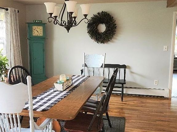 Large ranch with great open family floor plan. It sits on a large corner lot with a large fenced in back yard and in a quiet established community.. The kitchen is updated with a breakfast island, inset lighting, and a window over the sink. The kitchen opens up into a large dining area perfect for family and friends to gather and relax. The living room is a large 12 x 25 with a large window/plant box, a slider that opens unto the patio for the summer and there is also a wood stove to save on the heating bill and add ambiance in the winter. The half bath is conveniently located off the living room and includes the washer and dryer. The master bedroom is 16 x 9 and has a walk-in shelved closet. The furnace and oil tank are only three years old and there are 3 zones of heat to control your heating bill while maximizing your comfort. The almost 1/4 acre lot is level and well maintained with established plantings. No work to be done, just move in and enjoy!