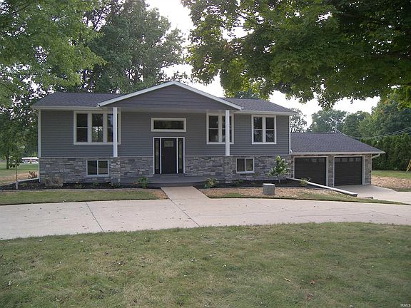 Paradise found! Immediate possession available with this masonry & vinyl sided 4 bedroom 3 bath professionally remodeled split-level waterfront home in Lake Forest subdivision at the north side of Big Chapman Lake. Covered 6x20 front entry Azek deck with sidelight front entry door leading to the foyer. Upper level offers a vaulted great room with vinyl plank flooring and large windows for natural lighting. Living room has a flush mounted 70 inch LG 4K TV and a recessed LED lit infrared electric fireplace. The dining room has a new Anderson 6 foot slider leading to the 10x40 Azek balcony deck with matte black aluminum deck railing overlooking the spacious rear yard and boat docking area on a Big Chapman Lake channel. All new custom Copper River kitchen with soft close doors & drawers, quartz counter tops, under counter sink, 3x6 center island/breakfast bar, tile backsplash, under cabinet lighting and a premium appliance package (Frigidaire Gallery series): side by side refrigerator/freezer, dishwasher, microwave range hood, and a gas range oven with air fryer feature. Master BR suite has a new Anderson 6 foot slider leading to the rear balcony deck, a private bath with tile floor, quartz top Copper River vanity and a 4 ft tiled shower. The other two upper level BRs are decent sized. The hall bath has a tile floor, quartz top Copper River vanity and a whirlpool bathtub with tile surround. Lower level features a family room with a new 8 ft Anderson glass slider (leading to the new 10x45 concrete patio) a Copper River wet bar with quartz counter top, Hisense wine/beverage cooler and a mini fridge plus a 3rd bathroom with tiled shower. The lower level also features a 4th bedroom plus spacious 21x27 rec room with a new 8ft Anderson glass slider (leading to the rear patio). The finished garage is heated (Lennox hanging unit heater), has wifi garage door openers, rear facing overhead door and a pull down attic stairs. Amenities include: new Anderson windows, Spanish laced ceilings, LED lighting, wifi thermostat, new ceiling fans & light fixtures, dual flush toilets, new 13 SEER central AC, new 40+ year roof shingles, new downspouts & gutters, concrete driveway & more! Big Chapman Lake is located one hour from Fort Wayne and South Bend and two hours from Indianapolis and Chicago. It is a spring fed all-sport lake (one cleanest lakes in Indiana) and is connected by a 2-way channel to Little Chapman Lake (10 mph fishing lake). Good boating, swimming & fishing.