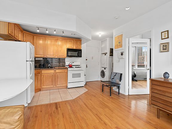 The open kitchen features maple cabinetry, marble countertops, new dish washer and four-burner gas range, refrigerator, microwave, and an in-unit washer and dryer for added convenience. The bedroom comfortably accommodates a queen-size bed and multiple dressers, while the spacious, fully tiled bathroom boasts a pedestal sink, custom tilework, and a vanity mirror. Dual heating and cooling units in each room allow for year-round climate control. Utilities for gas heat and electricity are tenant-paid. Cats welcome; sorry, no dogs. Located steps from the Lower East Side's vibrant mix of bars, boutiques, and dining destinations, with the F train just one block away at East Broadway.