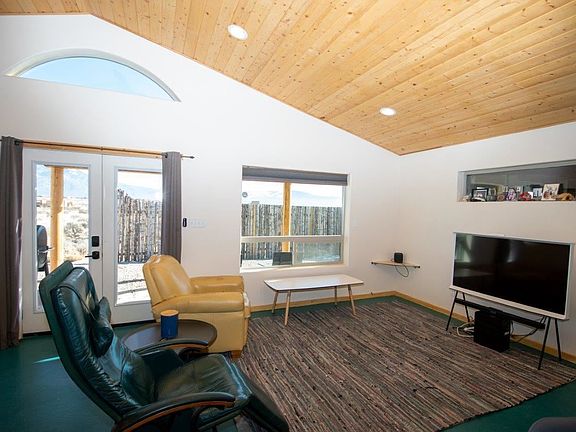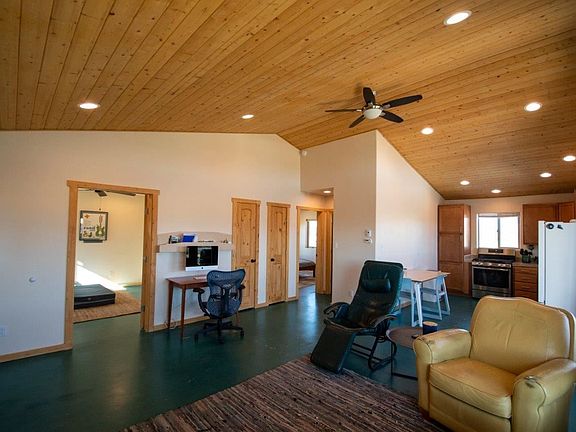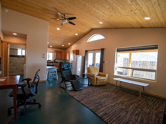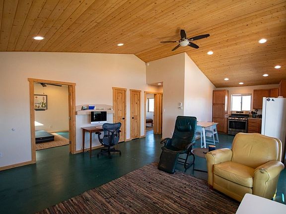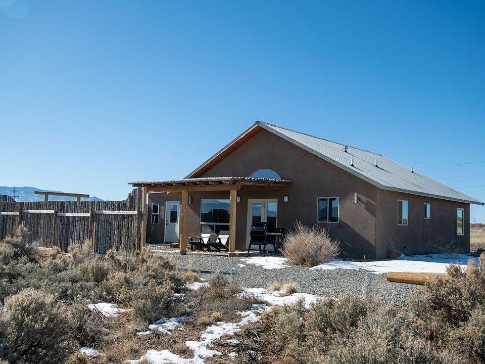 Easy Living - 2BR/2BA 958 sq.ft. territorial style home on 2.0 acres features vaulted ceilings with tongue and groove finish, open living area with lots of windows and a split floorplan. Built in 2018 with modern energy-efficient construction and design. Stained concrete floors with sub-floor radiant heating, ceiling fans will keep you warm in the winter and cool in the summer all while saving on utility expense. Abundant windows add passive-solar heat gain while providing panoramic Taos Mountain views, sunset and sunrise views while inside the home. Eat-in kitchen features great views, lots of cabinetry. Split floorplan provides prviacy and gives you options on the usage. An office/guestroom perhaps? Work from home, stream media, zoom calls and more with fiberoptic home connectivity. Bathrooms features walk-in shower while the other has deep soaking tub for relaxation. Mountain facing patio and outdoor sitting areas create low maintenance inviting outdoor living. Versatile 286 sq.ft. enclosed studio/workshop/garage could be finished out to create additional formal heated living area. Lots of possibilities! Located in a small residential development with easy access to Taos Ski Valley, outdoor recreation, & Town. With this well-maintained welcoming home, you'll have time to enjoy it all!