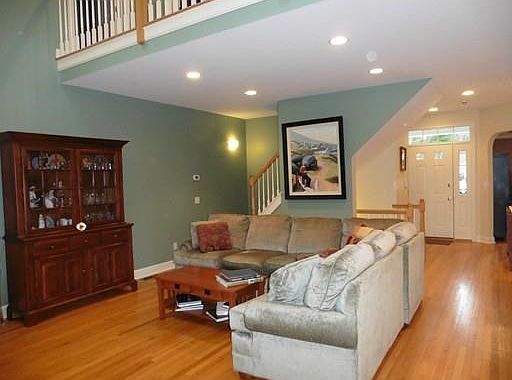 Fantastic end unit townhouse that has been beautifully maintained. Wonderful kitchen has large kitchen island with granite counters and ceramic backsplash. Walk-in butler's pantry and dining area with sliders to screened porch. Living room has gas fireplace with marble surround, vaulted ceiling, skylights, recessed lighting and door to deck. Dining room used as den has tray ceiling with recessed lighting. Spacious master bedroom with walk-in his/hers closets. Master bath has newer walk-in shower with ceramic and glass surround and Jacuzzi whirpool tub. Second floor with loft, full bath, bedroom with French doors and door to large walk-in attic, bedroom with two closets. Newer hardrwood floors with cherry inlaid on second floor and master bedroom. Additional living space in finished basement has rec. room with wall to wall, full bath, cedar closet and two finished rooms with wall to wall. Move in, carefree living in The Woods.