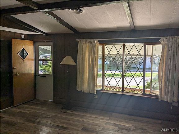 All occupants must be 55 or older. Midcentury deluxe model two bedroom mobile home with many upgrades in quiet and beautiful park with mature trees and good neighbors on a oversized lot. Living room has high, beamed ceiling that opens to dining area. Gas furnace with hot water heat, recently insulated with thick spray foam underneath for economical and cozy. Central A/C. All new pex plumbing lines throughout. New luxury vinyl floors in living, dining, hall, and bathroom. Washer and (older) dryer in closet in bathroom. No maintenance metal roof. Lots of windows. Nice yard, patio, and shed. Walk to inlet trail over new pedestrian bridge. A few minutes walk to Wegman's, an easy walk to all shopping on S. Meadow or even Downtown. Blacktop driveway parking for two cars, or use all or part of the covered patio as a carport. Park is tranquil, with mature trees and many deer visitors. Easy approval. Lot rent of $585 (stabilized by State Law) includes property taxes, water, maintenance of common areas, use of community building (free reservations for private parties, optional  community events, etc.) and is eligible for STAR rebates. All measurements are approximate.