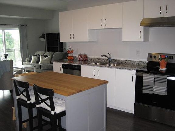 Newer two bedroom condo in south end of Guelph. 35 Kingsbury Square community located at Clair and Victoria Road. Close to university and numerous south end amenities. Five minute walk from new Guelph Public Library, Galaxy theater, Goodlife health club, LCBO, Beer Store, and strip plazas. Grocery stores include Food Basics, Zehrs, Shoppers Drug Mart, and brand new Longos. Banks include TD, Scotiabank, BMO, Royal, CIBC, & Meridian. Local restaurants include The Keg, State & Main, Shoeless Joes, Chucks Roadhouse, Kelseys, Pita Pit, Harveys, Tim Hortons, Starbucks, & Subway. Located on #5 bus route, providing direct routes to campus and downtown. THE GEOFFREY - 885 Square Feet. Fourth floor suite with balcony. Two Bedrooms: One larger master bedroom, and one generous second bedroom, both with sliding door closets. One 4-piece bathroom & vanity. Full kitchen with white cabinetry, granite counter tops, and stainless steel appliances (fridge, stove, & dishwasher). Vinyl plank flooring throughout. Air conditioning included. Stacked washer & dryer. Available October or November 1st for 12 month lease. $2200 + Utilities Extra. Strictly one parking space. Looking for working professional singles or couples. Reference, employment, & credit checks required. Utilities Extra 1 Parking Space Only No Smoking Small pets allowed 1 Year Lease Last Month's Rent Security Deposit Credit & Employment Checks Required