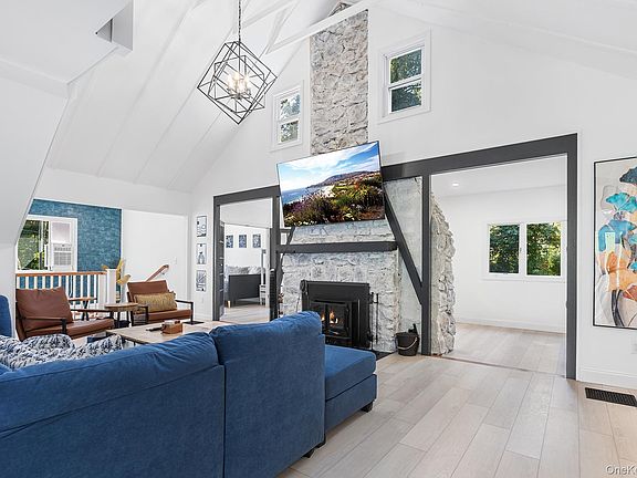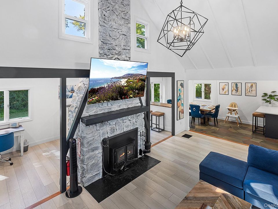 At its heart, a dramatic open living room rises with cathedral ceilings, anchored by a soaring floor-to-ceiling stone fireplace. The extended kitchen, with abundant cabinetry and counter space, flows effortlessly into the dining room and breakfast bar—designed for gathering and everyday living alike.