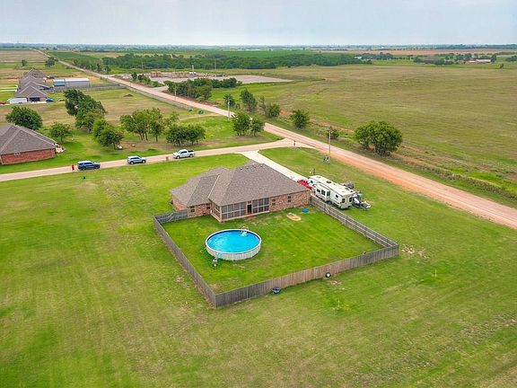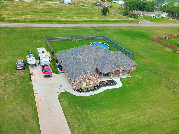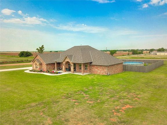 Over 1.65 acres on a corner lot w/ a pool and many added features and upgrades. Plenty of room to add a shop..Such a beautiful entrance to this open floorplan - custom barn doors separating your private study (4th bed) from the main entrance. The living area has wood tile flooring and a beautiful brick fireplace. Kitchen features include thick granite countertops, a long breakfast bar, pantry, and open dining room. The private master is good size with lots of crown moulding, raised ceiling and back patio entrance. The master bath has double vanites, jetted tub and walk in shower. All bedrooms are good size with walk in closets. Exterior features huge covered front porch surounded by colorful lanscaping, wood privacy fence with steel poles, swimming pool, full guttering , large semi-enclosed back patio & storm door. Lrg storm shelter. No burdens of HOA, choose Yukon,Mustang,El Reno High School.