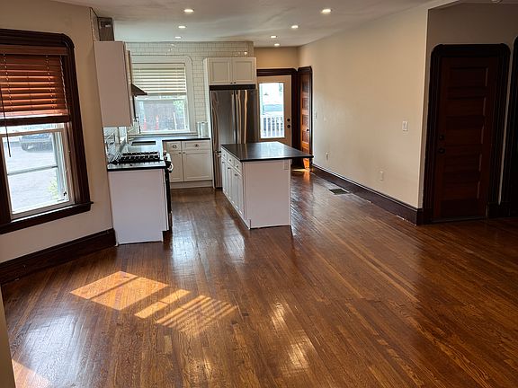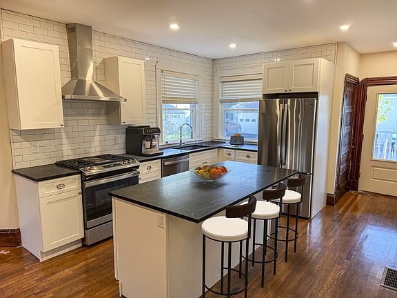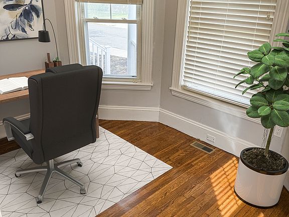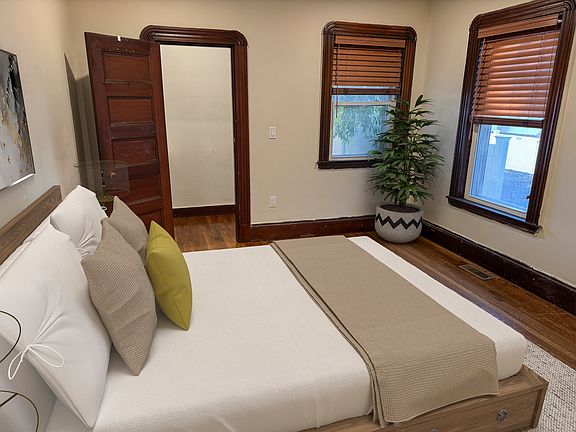 Fully renovated unit with all the amenities, and terrific outdoor spaces. Unit 1 of this 3 unit building has 2 bedrooms and 1 bath, large office, and a mix modern conveniences with classic details. Single level living, all on the first floor. Open-concept living/kitchen, generous bedrooms with glass enclosed walk in shower and organized closets, enhanced by high ceilings, and large windows throughout. Great bay office filled with windows and pocket door to give privacy. Brand new 200 sq ft deck off the kitchen. New high efficiency heat pump systems delivers heat and central air in a fully insulated building at low costs, plus gas fireplace to add beauty and practicality. Gas cooking, stainless appliances and even in-unit, full-size laundry, and off-street parking. Dog friendly with restrictions. (Furniture is virtually shown to give an idea of it in the space)