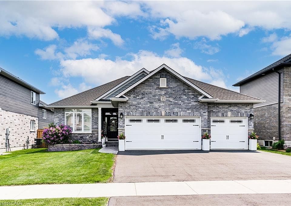 Welcome to this meticulously maintained 4-year-old bungalow, nestled on a quiet street in beautiful Innerkip. From the moment you arrive, the 3-car garage and thoughtful landscaping set the tone for the quality you’ll find throughout the home. Inside, the open-concept main floor impresses with 9-foot ceilings, hardwood flooring, and California blinds that blend style with function. The living area is warm and inviting, centered around a gas fireplace. The kitchen is a showstopper: it features granite countertops, high-end appliances, a generous walk-in pantry, and walkout access to a low-maintenance, durable vinyl deck. A mudroom off the garage adds everyday convenience, while three spacious main-floor bedrooms are paired with two full bathrooms for easy, one-level living. Downstairs, the bright and fully finished basement offers two oversized bedrooms with large windows, two additional full bathrooms, and ample storage and closet space. With 200 amp service, top-tier finishes throughout, and a smart layout designed for comfort and ease, this home is a standout. Bright, beautiful, and move-in ready—it’s everything you’ve been looking for in one incredible package