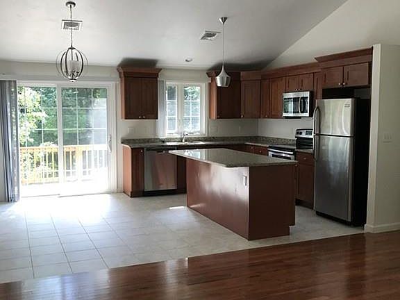 Beautifully renovated duplex featuring vaulted open floor plan! Living room with new hardwood flooring and fireplace. All new fully-applianced kitchen with granite counters, center island and sliders to deck. New flooring and paint throughout! Finished lower level with second full bath, washer/dryer and garage under and central air! Conveniently located on dead end street across Rt 9 from UMASS! Good credit and references required.