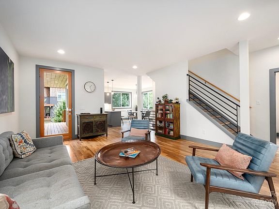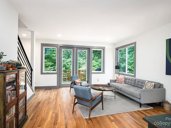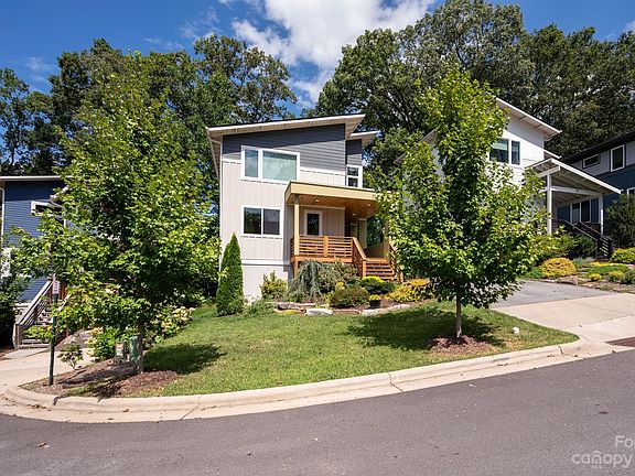Modern GreenBuilt, Energy Star home by JAG Construction in Craggy Park — West Asheville’s unparalleled community designed to connect people and sustainability. Come home to streamside trails, organic gardens, and a private park, just a short walk to town. This gorgeous customized home shines with a fantastic open light-filled floor plan designed by award-winning Wilson Architects. Tasteful features include a gourmet kitchen, dedicated main-level office, beautiful hardwood floors, and oversized windows for abundant natural light. Three bedrooms and two full baths on the second level include the primary suite featuring a vaulted ceiling, two closets, and ensuite bathroom. The premium finished walk-out basement boasts polished concrete floors, a large bedroom, full bathroom, and an amazing media/bonus room. Desirable outdoor living with a covered wraparound front porch, sunny back deck, and covered lower-level patio. More tool + toy storage underneath the back deck and front porch.