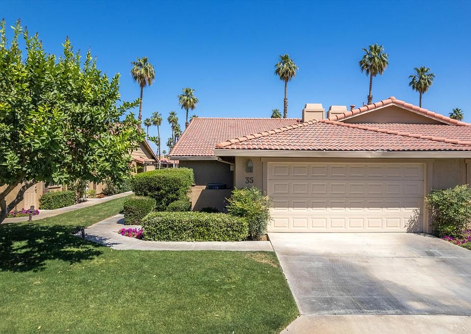 This fully renovated 3BD 2BA condo end unit in Chaparral Country Club boasts panoramic views of the lake, mountains, and the 18-hole Ted Robinson-designed executive golf course. The sheltered outdoor lanai, enclosed on three sides and integrated into the structure's roofline, offers a welcoming area to appreciate the desert scenery and climate. The condo's interior features a spacious, window-lined entertainer's kitchen equipped with a Bosch dual fuel range and oven, an LG stainless steel refrigerator, a range hood, a dishwasher, and a Sharp under-counter microwave. Quartz countertops and a meticulously tiled backsplash enhance the kitchen's appeal. Newly installed energy-efficient windows and sliding doors are present throughout. Flooring updates include large 24x48 inch porcelain tiles, while the bedrooms remain comfortably carpeted. Custom roll-down blinds are installed in every room. The garage is finished with an epoxy-coated floor and includes a utility sink with both hot and cold-water options.Chaparral Country Club, located at the core of Palm Desert, provides round-the-clock guarded security, a recently renovated clubhouse featuring a restaurant and bar, illuminated tennis and pickleball courts, and a fitness center.Please note, the ''photos are staged'' and no furnishings are included. The images do not display the Bosch oven, three additional ceiling fans, or the window treatments.