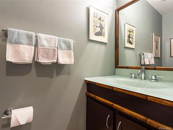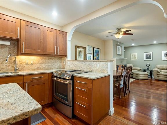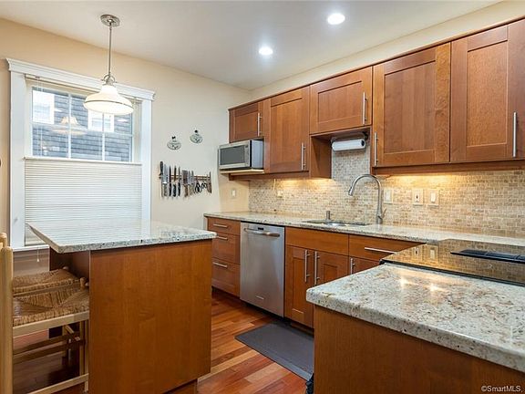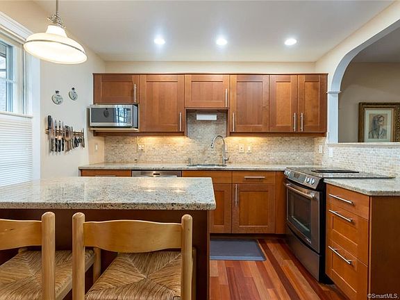 Sunny and spacious Townhouse in popular Springdale neighborhood. Located just steps away from Park and School. Short walk to Train Station, Shops, and Restaurants. Enjoy many updates including: newer kitchen with stainless steel appliances, granite counters, center island, and Tumbled Marble backsplash. Kitchen opens to formal Dining Room featuring beautiful Hardwood floors that lead into spacious Living Room. LR has wood burning fire place and sliders that access to private deck. Two large Bedrooms upstairs. Master has Full Bathroom. Lower level is partially finished with home office and offers tons of storage. Complex is conveniently located close to Merritt Parkway. Assigned parking space, visitor parking and street parking available. Driveway has just been paved, new stoops.