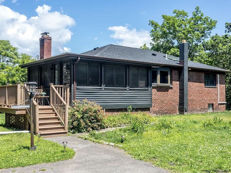 1957 Mid Century Modern STYLISH Brick home w/full finished basement and in-ground HEATED SALINE POOL. You could be floating in your POOL by Summer! Imagine coming home from a days hike in the CATSKILLS MOUNTAINS to relax in your HOT TUB while you enjoy nearby mountain views. Play cards in front of your cozy BRICK FIREPLACE. Gorgeous original exposed hand-hewn WOOD ceiling beams. Charming large open flow kitchen with coffee bar/breakfast nook. Large fully enclosed porch and 2 decks...all on 1.6 ACRES with new wooden privacy fence. Home has been recently renovated. Attached garage with remote control. Large level lot with fire pit and GREENHOUSE. The list goes on... Perfect location. Under 10 min to Woodstock, Downtown Kingston and Adams Fairacre Farms. World class Michelin star restaurants all a short drive away. Both Amtrak Train access and Trailways bus conveniently accessible. Successful rental income. Turn key and move in ready. Interior designer level furniture available upon request.