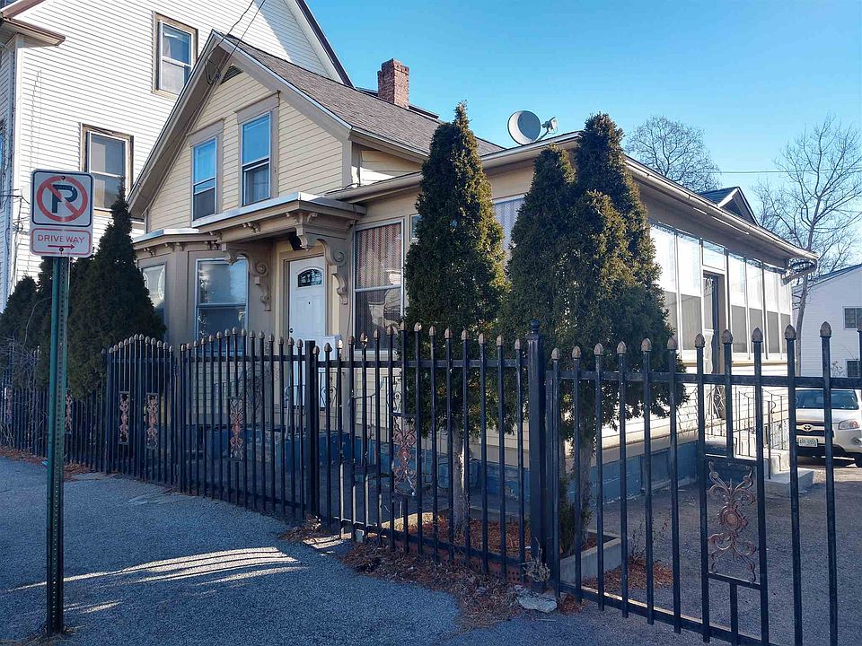 Northeast Manchester! Surprisingly bigger inside than front view might suggest! 3 levels finished, with walk-out rear door on lower level to European-type courtyard patio & children's area with great playgym..Attractive iron-fence and driveway gate (estate-style!). Paved parking for 6 cars. Inside has 7 rms, 3-4 bedrms, 2 baths, 10x16 sunporch on side, much hardwood flooring,French doors, nice features. House remodeled about 8 years ago.20-yr owner, relocating. Has TAW, so 24-48 hr notice, please. An easy 5 minutes to downtown or I-93 exit #8.
