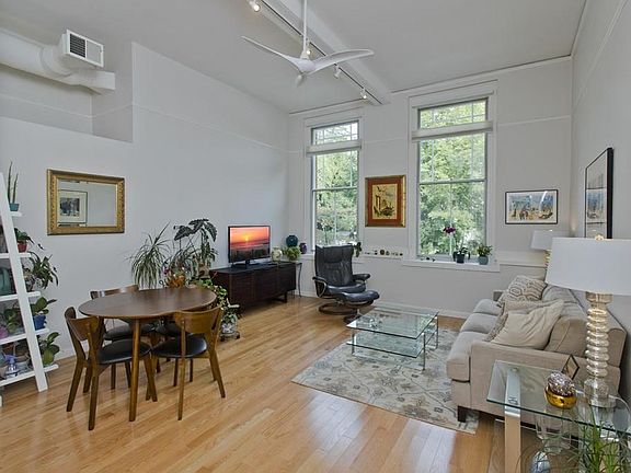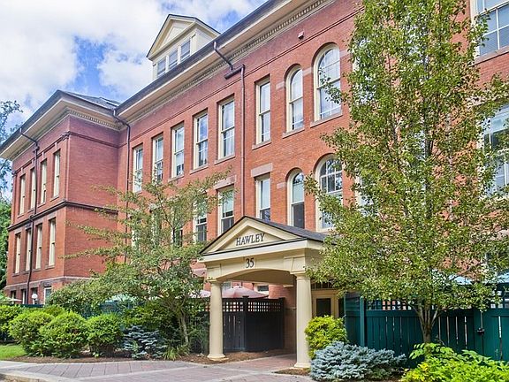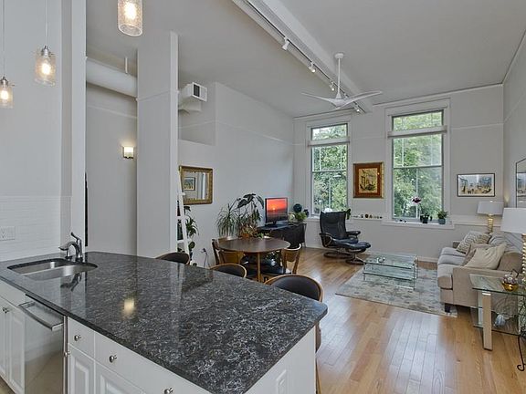 In the heart of downtown Northampton is this lovely remodeled two bedroom corner unit. Located in the very desirable Old School Commons, this unit is in the back corner on the 2nd floor, far away from the road and just a 1/2 flight up the stairs from the side entrance. Easy in and out! Over the past 3 years the owners have installed new hardwood floors in the living areas and bedrooms, new quartz countertops in the kitchen and bath, high-end stainless steel appliances, gorgeous top down/bottom up window shades, ceiling fans, lighting fixtures, new bath sink and shower doors, and had the entire interior painted. With 12' ceilings and 8' windows, the natural light pours in and gives a nice loft feel to the space. Additional features include in-unit washer and dryer, natural gas heat, central air, walk-in closet, corner location overlooking the woods in the back, and 2 parking spots in the gated parking lot. Additional storage next door. SHOWINGS START RIGHT AWAY! Video tour attached!