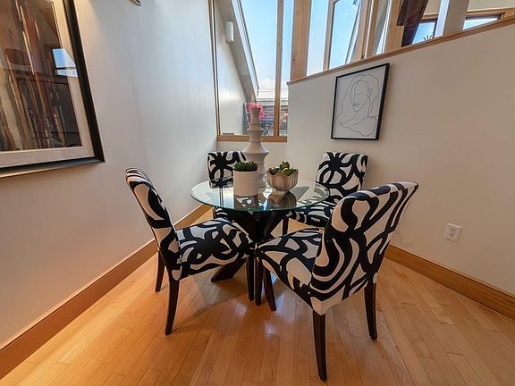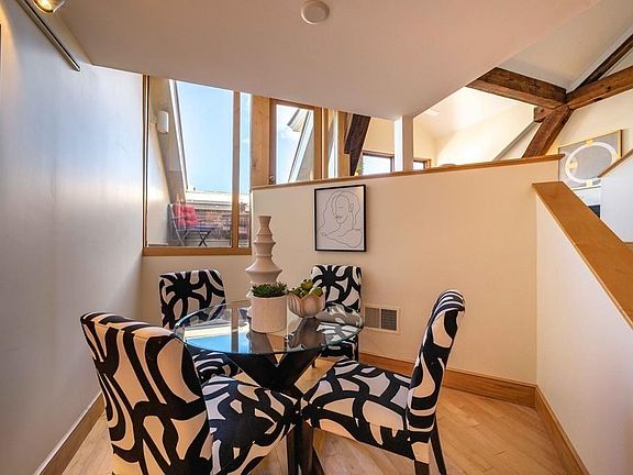 Easy to show, currently unoccupied. Text agent for video tour link. This elegant one bedroom, two full bathroom, Penthouse condominium in the prestigious Old School Commons is anything but conventional. 1400 sq ft open concept floor plan w/ massive beams that crisscross the cathedral ceiling. Kitchen features granite counters, stainless steel appliances, and a breakfast bar. The living room has a NYC loft feel with hardwood floors, bank of windows, and access to the private patio. Master with en-suite bath enjoys radiant heated flooring and a spa tub, walk-in closet, built-ins, and full size loft. Skylights imbue the vaulted space w/ light while maintaining privacy. Home office w/ built-ins and views of downtown, and the private rooftop patio. Washer and dryer conveniently located in unit. Old School Commons is one of the only condos in downtown with an elevator and ample off street parking. Located within walking distance to Smith, Amtrak, Rail trail and all downtown has to offer.