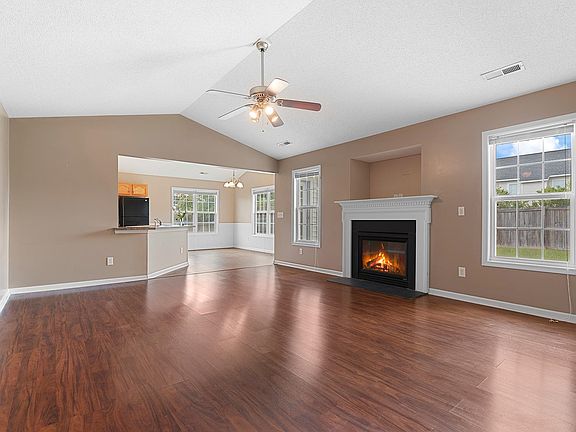 Welcome home to this wonderfully charming home on a .24 acre fenced in lot just two miles from quaint downtown Angier. Living room features cathedral ceiling, gas fireplace, laminate wood floors, and ceiling fan. Kitchen features a cathedral ceiling, oak cabinets, mosaic and metal tile backsplash, and black appliances (including electric glass top range, microwave, dishwasher and refrigerator). Primary bedroom features a walk in closet and ceiling fan. Primary bath features comfort height dual vanity, garden tub and separate shower. Secondary bath offers a single oak vanity and tub/shower combo. Two additional bedrooms share the hall bath. There is an ample bonus room over the garage with vaulted ceiling and separately zoned AC/Heat. The two car garage has been outfitted with a work bench and plenty of built in storage. Low maintenance vinyl siding.